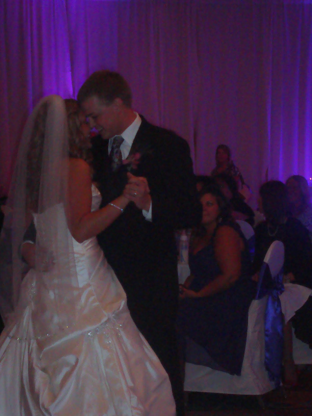 We headed to the reception, draped with purple walls and glowing with ambient lighting. As we began to eat, we were greeted by a video of the bride and groom on a big screen. "Hi, we're the Colliers!" they greeted. They said they were taking photos at the moment and would join shortly. They then laid out the rules for the night's reception. (Must dance, Do not mess with the purple walls, etc.) It was stinkin cute just like them and everyone clapped and cheered.